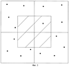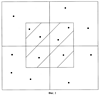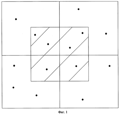 На фиг.1 показан пример конфигурации точечных объектов, расположенных на листе плана местности формата 20×20 см. В предположении, что минимальное и максимальное количество точечных объектов на 1 кв. дм составляют 2 и 5, на этом примере четыре тестовых квадрата со стороной 1 дм содержат соответственно 3, 4, 4 и 3 точечных объекта, то есть количества точек внутри тестовых квадратов, соответствующих паркетному разбиению листа плана, удовлетворяют требованиям на минимальное и максимальное число точечных объектов. Однако заштрихованный тестовый квадрат содержит 6 точек, что недопустимо. Таким образом, использование наряду с тестовыми квадратами соответствующих паркетному разбиению листа плана, дополнительных тестовых квадратов позволяет выявлять места чрезмерно большой плотности точечных объектов, которые не выявляются при использовании только “паркетных” тестовых квадратов. На фиг.2 показан пример конфигурации точечных объектов, для которой дополнительный тестовый квадрат выявляет место чрезмерно малой плотности точечных объектов.