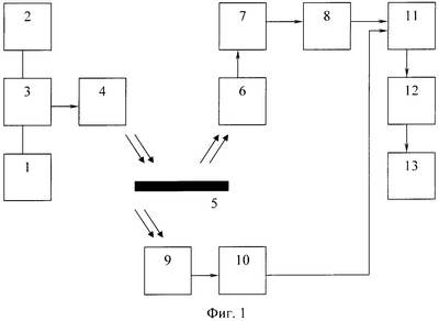 На Фиг.1 показаны источник ультрафиолетового излучения 1, источник переменного напряжения 2, газоразрядная лампа 3, блок защиты смотрового стекла источника ультрафиолетового излучения 4, контролируемая банкнота 5, фотоприемник переизлученного от контролируемой банкноты оптического излучения 6, масштабный усилитель 7, фильтр верхних частот 8, фотоприемник энергии ультрафиолетового излучения 9, усилитель-ограничитель 10, демодулятор 11, фильтр нижних частот 12, исполнительный блок 13.