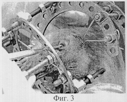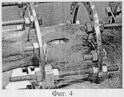 Далее отломки заправляют обратно в рану, где точно сопоставляют (Фиг.4). Резьбовые стержни устанавливают на исходное место. На мягкие ткани накладывают послойно узловатые швы.