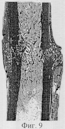 К этому сроку на гистотопограммах определялось костное сращение, сформированное эндостальной, интермедиарной и периостальной мозолями. В зоне перелома остеоны имели неправильное направление. В костно-мозговой полости сохранялись участки эндостального регенерата, костные трабекулы которого подвергались остеокластической резорбции. В обоих отломках на протяжении 8-10 мм костный мозг был ретикулярный, отечный, с выраженными расстройствами микроциркуляции, что характеризовалось явлениями стаза и наличием диапедезных кровоизлияний (Фиг.9).