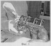 К 60 дню опыта на рентгенограммах линия остеотомии была перекрыта тенями, оптическая плотность которых приближалась к плотности близлежащих участков. Тени эндостального регенерата в проекции формирующейся единой костно-мозговой полости слабо определялись лишь около концов отломков. Периостальные разрастания заметно компактизировались. В это время на основании клинической пробы прекращали фиксацию аппаратом (Фиг.7).