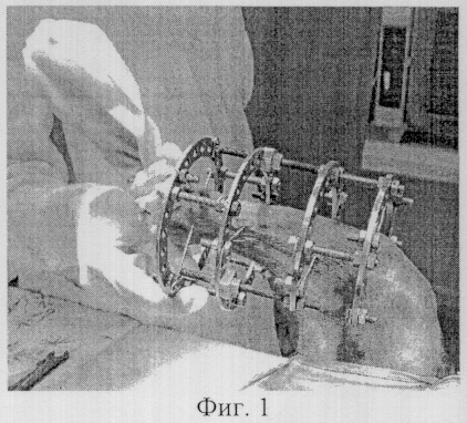 В условиях операционной животному под общим барбитуровым наркозом, после обработки операционного поля 5% спиртовым раствором, йода на голень накладывают аппарат для чрескостного остеосинтеза, состоящий из двух подсистем (проксимальной и дистальной), соединенных между собой тремя резьбовыми стержнями. При этом проксимальная подсистема состоит из двух дуговых опор, дистальная – из двух кольцевых (Фиг.1). В области средней трети голени, с латеральной и медиальной сторон, проводят продольные разрезы кожи, с последующим тупым препарированием прилегающих к кости мягких тканей. Через разрезы, при помощи пилки Джигли осуществляют поперечную остеотомию берцовых костей. Мягкотканые элементы предварительно отграничивают от кости леваторами (Фиг.2). При этом происходит одномоментное пересечение остеогенных тканей (надкостницы, костного мозга) и питающих кость сосудов. После остеотомии убирают стержни, соединяющие подсистемы аппарата. Затем поочередно, через медиальный разрез выводят отломки из раны.