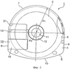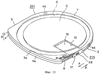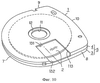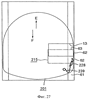 Как показано на фиг.14 и 17, в области вертикальной секции 4а периферийной стенки нижней половины 4 картриджа 201 для диска, в соответствии с настоящим изобретением, сформирован вырез 25. То есть область отверстия для части 13 головки, продолжающаяся от внутренней окружности до внешней окружности основного блока 5 корпуса картриджа, открыта.