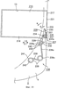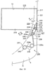 Соответствующая часть 229 зацепления на основном блоке 5 корпуса картриджа установлена в области внутренней поверхности нижней половины 4 картриджа, за пределами области секции 6 установки диска, и может зацепляться с деталью 231 сцепления рычага 228 фиксатора, когда блок 215 задвижки находится в закрытом положении. Соответствующая часть 229 зацепления сформирована как единая деталь с нижней половиной 4 картриджа. Соответствующая часть 229 зацепления сформирована с выемкой 229а зацепления, открытой с одной стороны. В эту выемку 229а зацепления входит деталь 231 зацепления, которая сформирована на рычаге 228 фиксатора.
