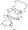 С одной стороны верхней поверхности основного блока корпуса устройства 251 расположены кнопки 256, 257 привода переключателя управления, используемого для проведения, например, телевизионной игры. С другой стороны расположена кнопка 258, предназначенная для прокрутки изображения, демонстрируемого на дисплее 252. Здесь также установлен громкоговоритель 259, предназначенный для излучения звуковых сигналов, воспроизводимых с оптического диска 2.