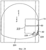 Если картридж 201 для диска перемещают далее в направлении, обозначенном стрелкой Е по фиг.27, поскольку движение блока 215 задвижки задерживается, на основном блоке 5 корпуса картриджа открывается отверстие для части 13 головки, при этом витая пружина 239 кручения, формирующая блок 238 открывания/закрывания задвижки, смещается, как описано выше, со ссылкой на фиг.19 и 20. Когда основной блок 5 корпуса картриджа перемещают в направлении, обозначенном стрелкой Е на фиг.27, так, что витая часть 239с проходит место расположения упорной шпильки 242, которая установлена вдоль направления движения блока 215 задвижки, смещая, таким образом, витую пружину 239 кручения, направление смещения витой пружины 239 кручения меняется на противоположное. Блок 215 задвижки при этом перемещается в направлении стрелки F по фиг.27, которое противоположно направлению движения основного блока 5 корпуса картриджа, открывая, таким образом, отверстие для части 13 головки, как показано на фиг.11, 21 и 28. Блок 215 задвижки смещается под действием витой пружины 239 кручения, открывая отверстие для части 13 головки и, таким образом, надежно поддерживая открытое состояние отверстия для части 13 головки.