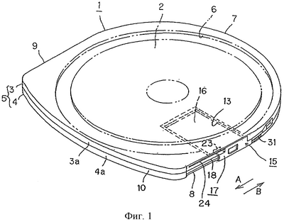 На фиг.3 показан вид в плане, представляющий картридж для диска, в соответствии с настоящим изобретением, со стороны нижней половины картриджа.