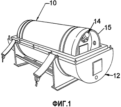 Самые важные улучшения контейнера 10 настоящего изобретения, полностью удовлетворяющего техническим требованиям, будут описаны подробно только в тех деталях, насколько они отличаются от известного стандартного контейнера. Стандартный контейнер 10 типа 30В изготовлен согласно АНИС N14.1 и Нормативов Американского института инженеров-механиков для котлов и паровых сосудов. Раздел VIII, Подраздел 1. Соответственно стандартный контейнер 30В имеет размер 81 1/2 дюйма плюс или минус 1/2 дюйма и имеет диаметр 30 дюймов плюс или минус 1/4 дюйма. Стандартный 30В контейнер имеет минимальный объем 26 кубических футов. Эти размеры используются предпочтительно для контейнеров, изготовленных согласно АНИС N14.1-2000 и поэтому имеет такие преимущества, которые описаны в патенте США №5777343, который основан на отсутствии сваренных полос жесткости. Однако преимущества настоящего изобретения могут также быть получены с контейнерами, изготовленными по более ранним версиям АНИС N14.1, которые требовали наличие сварных полос жесткости.
