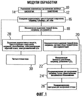 В случае, когда органические компоненты разрушают окислением, осаждение радионуклидов, присутствующих в виде ионов, возможно при добавлении соответствующих химикатов, таких как сульфиды и/или неактивные соли металлов, для повышения концентрации специфических нуклидов (например, кобальта) и/или при смещении pH (например, с pH 8 до pH 9). Если стадия аэробной биологической обработки предусмотрена как модуль 14, этот этап, который на фиг.1 обозначен номером 16, при необходимости не проводят, так как в предварительной биологической обработке описанными подходящими технологическими режимами биореактора преобладающая часть растворенной радиоактивности поглощается посредством биосорбции в бактериальную матрицу и, тем самым, может быть выделена в следующих модулях.
