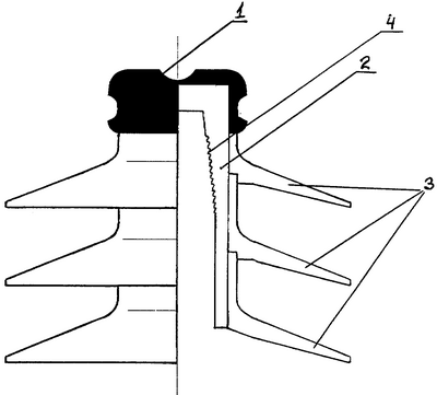 На чертеже изображена схема изолятора, где 1 – головка, 2 – зона крепежа (стеклопластиковая трубка), 3 – кольцевые ребра, 4 – резьба на внутренней поверхности зоны крепежа.