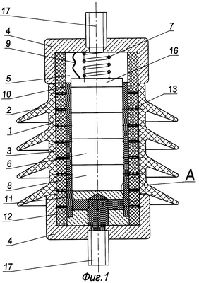 На концах колонки 6 соосно с ней могут быть расположены медные шайбы 16 (фиг.1), служащие для распределения тока по всему сечению варисторного диска 8. В оконцевателях 4 установлены шпильки 17 (фиг.1), которые служат для крепления к ограничителю перенапряжений контактных проводов.