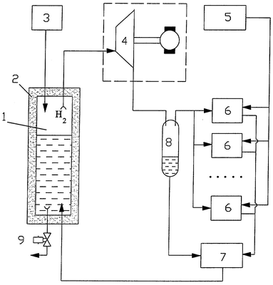 После загрузки реагентов в генератор водорода (1) из системы подачи реагентов (3), в генераторе водорода начинается реакция с выделением водорода и саморазогревом смеси, которая постепенно доводится до кипения. Горячий водород с парами воды подается на лопатки газовой турбины газотурбинного блока (4), в результате приводится в действие электрический генератор или насос. После расширения в газотурбинном блоке (4) из пароводородной смеси конденсируется содержащаяся в ней вода, а оставшийся водород поступает в ресивер водорода (8). Здесь же собирается сконденсированная вода, которая затем сливается в емкость для сбора воды (7). В дальнейшем вода направляется обратно в генератор водорода (1), что делает схему замкнутой «по воде».