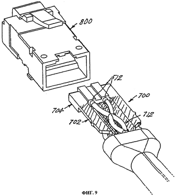На фиг.9 показан вид в перспективе нижней части вставки 700 вилки, в которую установлен кабель. Экранирующий элемент 702 на фиг.9 выделен штриховкой. Вставка 700 вилки используется с кабелем, разделенным на множество пар, причем каждая пара содержит проводник штекера и проводник кольца, как известно в данной области техники. Каждая пара расположена на экранированном участке 706, 708, 710 или 712 для экранирования пар друг от друга и для уменьшения уровня перекрестной помехи. На фиг.9 представлена разделенная пара (например, проводники 3 и 6), установленная на экранированный участок 712. Проводники расположены на экранированном участке 712 и затем введены в каналы 512 установки проводов загрузочной планки 704, как описано выше со ссылкой на загрузочную планку 504. Вставка 700 вилки установлена в корпусе 800, как описано ниже.