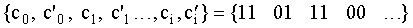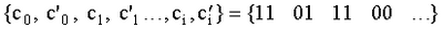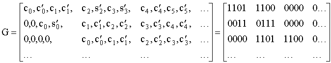 Вид порождающей матрицы сверточного кода определяется откликом на единичное воздействие на кодер, показанным на фиг.1 (а). Пусть в кодер поступает символ 1, за которым следуют символы 0. В таком случае отклик на такое единичное воздействие, то есть соответствующая выходная последовательность кодера имеет вид . Выходная последовательность, соответствующая произвольной входной последовательности, получается сложением по модулю 2 сдвигов указанной последовательности. Поэтому порождающая матрица может быть представлена в виде: