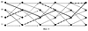Процесс декодирования сверточного кода представляет собой поиск пути с наименьшим весом по дереву, ветви которого представляют собой допустимые кодовые комбинации. Отбрасывание заведомо неправильных путей позволит избежать экспоненциального роста сложности в зависимости от длины кодового блока. Учитывая тот факт, что кодер является автоматом с конечным числом состояний, удобно графически изображать код, как решетчатую диаграмму. Для кодера, представленного на фиг.1 (а), решетчатая диаграмма показана на фиг.1 (б), где узлы соответствуют состояниям кодера, определяемым двумя первыми битами из линии задержки, а ребра соответствуют допустимым переходам и промаркированы соответствующими значениями выходных бит. В начальный момент времени t0 биты, записанные в линию задержки, определяют инициализацию кодера, обычно кодер инициализируют нулями. Каждый столбец – это состояние кодера в дискретный момент времени ti. В декодере каждый возможный путь накапливает свой вес путем сравнения с действительно принятой последовательностью, используя метрику Хемминга или метрику в мягких решениях. И, таким образом, продвигается в глубину решетчатой диаграммы, где глубина решетчатой диаграммы сверточного кода q в декодере соответствует дискретным отсчетам времени ti в кодирующем устройстве. Отметим, что в каждое состояние также приходят два пути, один из которых с худшей метрикой отбрасывается.