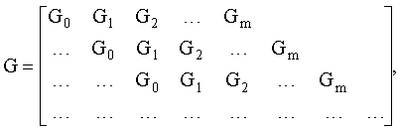 Как видно из способа построения матрицы, она имеет бесконечный размер, но, тем не менее, кодер достаточно просто реализуется на линии задержки.