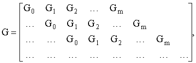 Сверточный код можно представить посредством порождающих подматриц, каждая из которых соответствует задержанному одному импульсному отклику, как показано на фиг.2 (см. R.Johannesson and К.S.Zigangirov, Fundamentals of Convolutional Coding. New York, NY, USA: IEEE Press, 1999 [4]). Размер подматрицы соответствует числу порождающих полиномов Gk={gk,1, gk,2} и определяет скорость кодирования R. Порождающую матрицу для сверточного кода в этом случае можно представить в виде: