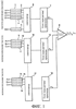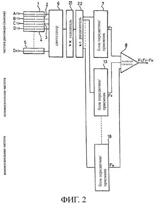 Фиг.2 – это блок-схема, иллюстрирующая конструкцию системы для генерации вспомогательной частоты в соответствии с настоящим изобретением. Рабочая частота включает сигнал А1 канала пилот-сигнала, сигнал В1 канала синхронизации, сигнал С1 канала поискового вызова и сигналы D1-DN канала трафика. Канальные элементы 1-5 выполняют цифровую обработку сигналов, включая разброс частоты, соответственно сигнала А1 канала пилот-сигнала, сигнала В1 канала синхронизации, сигнала С1 канала поискового вызова и сигналов D1-DN канала трафика. Обработанные сигналы синтезируются синтезатором 6 мощностей и подаются на блок передатчика/приемника 7 через усилитель 21 мощности и разделитель 22 мощности. Блок передатчика/приемника 7 преобразует полученный сигнал в сигнал радиочастоты F1, который затем усиливается линейным усилителем 8 и подается на антенну (не показана).