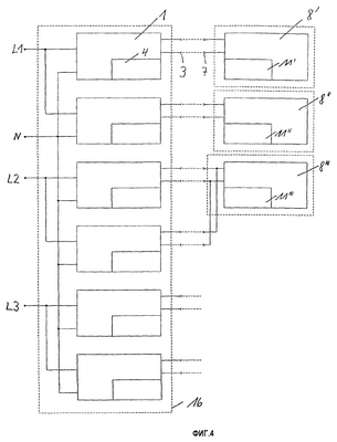 Шесть ПРА 1 питаются напряжением группами по два соответственно одной фазой L1, L2, L3 трехфазного присоединения относительно нулевого провода N.