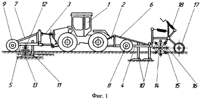 Комбинированный почвообрабатывающий агрегат имеет трактор 1; задние 2 и передние 3 навесные устройства; заднюю 4 и переднюю 5 рамы; навески 6, 7; опорные колеса с механизмами регулировки 8, 9; плоскорежущие лапы 10 и лапы 11; дисковую батарею 12; саблевидные рыхлители 13; барабан 14; штанги 15; трапецеидальные рыхлители 16; барабан 17; систему присоединения и управления 18 барабанами.