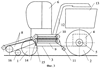 Подбирающее устройство 8 образовано двумя контактирующими транспортерами, нижний из которых включает барабан с убирающимися пальцами, шкив, установленный соосно нижнему шкиву зажимного транспортера 9, и охватывающий их ремень, а верхний (прижимной) представляет собой охватываемые ремнем два шкива.