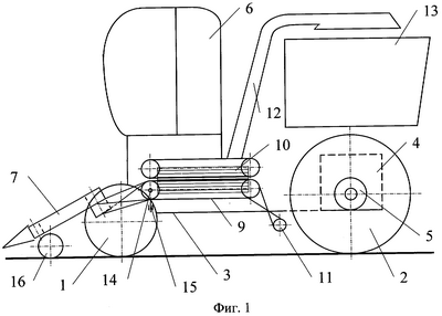 В начале уборки на самоходное шасси навешивают льнотеребилку 7 на горизонтальную ось 14 агрегата таким образом, что с помощью копирующего колеса 16 она может копировать рельеф поля, а также другие рабочие органы: очесывающее устройство 10, зажимной транспортер 9, пневмотранспортер 12, расстилочно-оборачивающий транспортер 11 и бункер для вороха 13.
