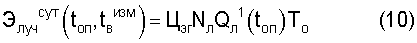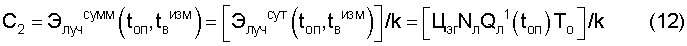 Суточные затраты на энергию С2 в системе лучистого электрического или газового обогрева Элуч сут(tоп, tв) пропорциональны удельной стоимости энергии данного вида Цэг, руб./кВт·ч, в данном регионе страны, количеству зон обогрева, или количеству лучистых обогревателей в помещении Nл, отн. ед., мощности применяемого обогревателя Qл 1(tоп, tв), кВт.