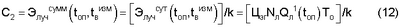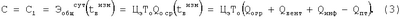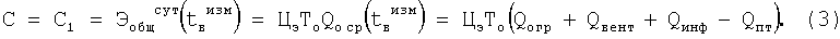Суточная стоимость тепловой энергии C1 (энергетические издержки производства С) на общий обогрев помещения Эобщ(tв изм=tоп з) – для математического моделирования величины С в технологическом диапазоне температур внутреннего воздуха значения tв изм приняты численно равными значениям формируемого искусственно сигнала tоп з – пропорциональна удельной стоимости применяемого энергоносителя Цэ, руб./кВт·ч, в данном регионе страны, длительности времени опроса биотехнической системы (суточного отопительного периода в 24 ч) То, и средней за этот период времени величине мощности системы общего (в данном контексте – лучистого обогрева помещения Qо cp(tв изм), кВт, которая определяется при средних за период То величинах температур внутреннего tв изм и наружного воздуха tн изм, °C: