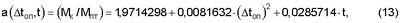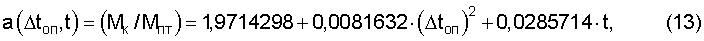 Математическая модель коэффициента затрат корма (отношение массы израсходованного корма к массе выращенного бройлера) в зависимости от отклонения температуры среды обитания от соответствующего наивысшей продуктивности птицы значения температуры и от возраста бройлера по указанным рекомендациям: