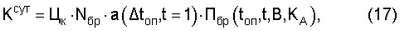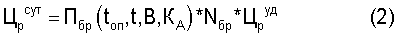 Из биологии известно, что различие в развитии однотипных организмов сохраняются на протяжении всего периода их роста, поэтому цена будущей реализации суточного прироста массы бройлеров Цр сут определяется значением этого прироста Пбр(tоп, t, В, КА), кг·10-3/сут, количеством бройлеров в помещении Nбр, голов (примем обычное количество 20 тыс. голов в стандартном птицезале размерами 18·96 м), удельной ценой реализации конечной продукции птицефабрики Цр уд, руб./кг (примем 40 руб./кг):