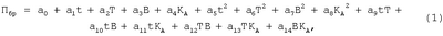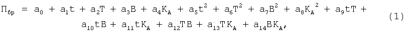 Математическая модель биологического объекта представляет собой зависимость продуктивности птиц (суточный прирост массы бройлеров от их возраста и от факторов микроклимата, в граммах массы) Пбр от возраста птиц t (в сутках) и основных параметров микроклимата – температуры воздуха Т (в градусах по шкале Цельсия), относительной влажности воздуха В (в процентах) и загазованности воздуха КА (массовая концентрация аммиака в воздухе, мг/м3) /см.: Грабауров В.А. Задача оптимизации микроклимата в промышленных птичниках с учетом расхода энергии на отопление. Рукопись представлена РИСХМ (Ростовским институтом сельскохозяйственного машиностроения). Деп. во ВНИИТЭИСХ. №537 ВС-85 Деп. – 17 с.; см. также: Грабауров В.А. Идентификация класса и структуры статической математической модели биологического объекта биотехнической системы в промышленном птичнике. – Рукопись представлена РИСХМ (Ростовским институтом сельскохозяйственного машиностроения). Деп. во ВНИИТЭИСХ. №469-84 Деп. – 6 с./: