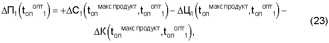 где G1(tоп макс продукт, tоп опт 1) – экономия издержек, выигрыш в стоимости энергозатрат, полученный за счет частичного снижения продуктивности поголовья или за счет некоторого уменьшения цены реализованной в будущем продукции данной технологии Ц1(tоп макс продукт, tоп опт 1), а также за счет прироста расхода корма K(tоп макс продукт, tоп опт 1) в результате перехода от управления по критерию максимума продукции с любыми затратами при значении tоп макс продукт режима наивысшей продуктивности к управлению по критерию максимума прироста прибыли при экономически оптимальном значении tоп опт управляемого параметра.