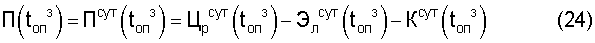 Целевая функция оптимизации значения управляемого параметра ощущаемой температуры tоп опт в виде показателя прибыли (суточной) П(tоп з), или показателя прироста прибыли (суточного) П(tоп з) при переборе искусственно формируемых значений tоп з, которые численно равны возможным измеренным значениям tоп в диапазоне между ее наименьшим и наибольшим заданными технологическими значениями будет: