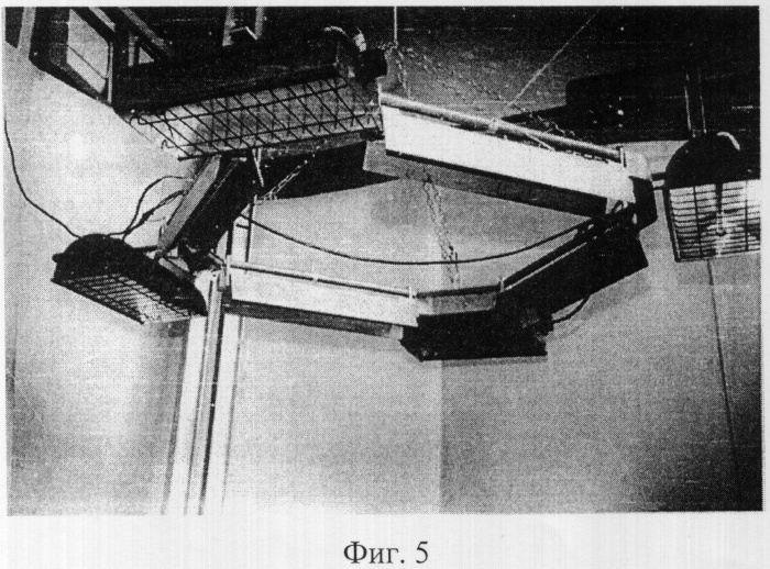 На фиг.5 приведена фотография экспериментального образца электрической инфракрасной люстры, состоящей из четырех облучателей типа «ЛИКИ» мощностью по 300 Вт каждый с питанием 220 В 50 Гц (вид снизу сбоку).
