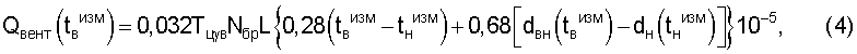 где Nбр – число бройлеров в птицезале, гол.; в 1,17 г/кг; L=70…100 м3/ч; tн – наружная температура, °С; dвн(tв з), dн(tн) – влагосодержание внутреннего и наружного воздуха, г/кг; Тц=t(t – по В.А.Грабаурову) – возраст поголовья, сут.