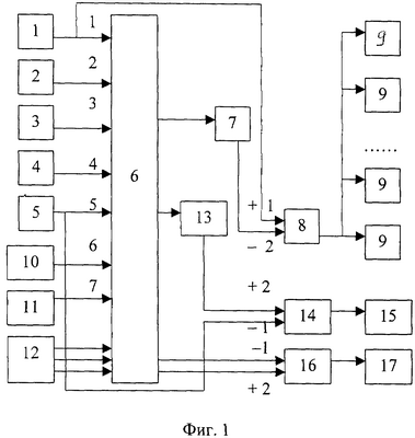 На фиг.1 приведена общая схема устройства по способу. Показаны датчик ощущаемой температуры помещения 1; датчик температуры наружного воздуха 2; датчик температуры внутреннего воздуха в помещении 3; датчик относительной влажности наружного воздуха 4; датчик относительной влажности внутреннего воздуха 5; вычислительный блок 6; блок управления 7; регулятор температуры 8; обогреватели 9 (электрические, газовые и т.п.); датчик концентрации аммиака 10; датчик расхода корма 11 (изменения массы бункерного накопителя корма, ленточный измеритель массы сыпучей кормовой смеси в ее потоке и т.п.); блок задатчиков возраста поголовья, технологически допустимых наименьшего и наибольшего заданных значений ощущаемой температуры, времени опроса, сигнала сформированной величины ощущаемой температуры, констант 12; элемент памяти 13; регулятор расхода корма 14; исполнительный элемент расхода корма 15; элемент сравнения 16; блок оповещения 17.