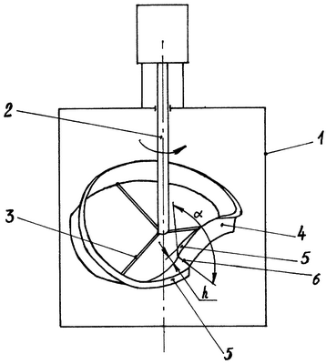После включения привода начинает вращаться вал 2, который через спицы 3 передает вращающий момент ленточной рабочей лопасти 4, выполненной в форме «листа Мебиуса». Рабочая лопасть 4 в форме «листа Мебиуса» начинает вращаться вокруг оси и этим самым начинает взбивать (перемешивать), например, жидкий продукт, состоящий из компонентов разной плотности. За счет того что рабочая лопасть 4 выполнена в форме «листа Мебиуса», вектор силового воздействия поверхности лопасти 4 и борта 5 на продукт в каждой точке соприкосновения изменяет свое направление от 0 до 360° за каждый оборот вала 2. Во время контактирования поверхности ленты 4 с продуктом, при ее вращении вокруг оси, возникает центробежная сила, которая стремится сбросить массу с поверхности ленты 4 (это наиболее проявляется, если продукт состоит из твердого и жидкого компонентов), но наличие борта 5 снижает это сбрасывание и позволяет переносить массу на поверхности ленты 4, то есть в углу между поверхностью ленты 4 и бортом 5 в другие сектора объема емкости 1, исключая возможность появления застойных зон. Все это позволяет интенсивно перемещаться продукту по кругу, вокруг оси, от оси, к оси, вдоль оси вверх и вдоль оси вниз, что в целом приводит к интенсификации процесса смешивания.