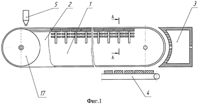 Устройство состоит из цепного пластинчатого конвейера 1, боковые стенки и полотно которого образуют пневматическую камеру 2, пневматической камеры удержания 3, приемного транспортера 4 и отливочной головки 5. Элементы полотна конвейера представляют собой секции, образованные жестко закрепленной в боковых стенках 8 верхней пластиной 6, и подвижной в вертикальной плоскости нижней перфорированной пластиной 9. Между пластинами 6 и 9 засыпан упругий слой сферических зерен 7. Каждая секция полотна передвигается по направляющим 11 при помощи роликов 10. Конвейер приводится в движение через звездочки 17 и пластинчатую цепь 16. Перемещение пластины 9 в вертикальной плоскости осуществляется при помощи исполнительного механизма, представляющего собой электромагнитный привод двустороннего действия, состоящий из якоря 15, верхнего 12 и нижнего 13 электромагнитов, соединенных при помощи стержней 14, изготовленных из неметаллического материала.