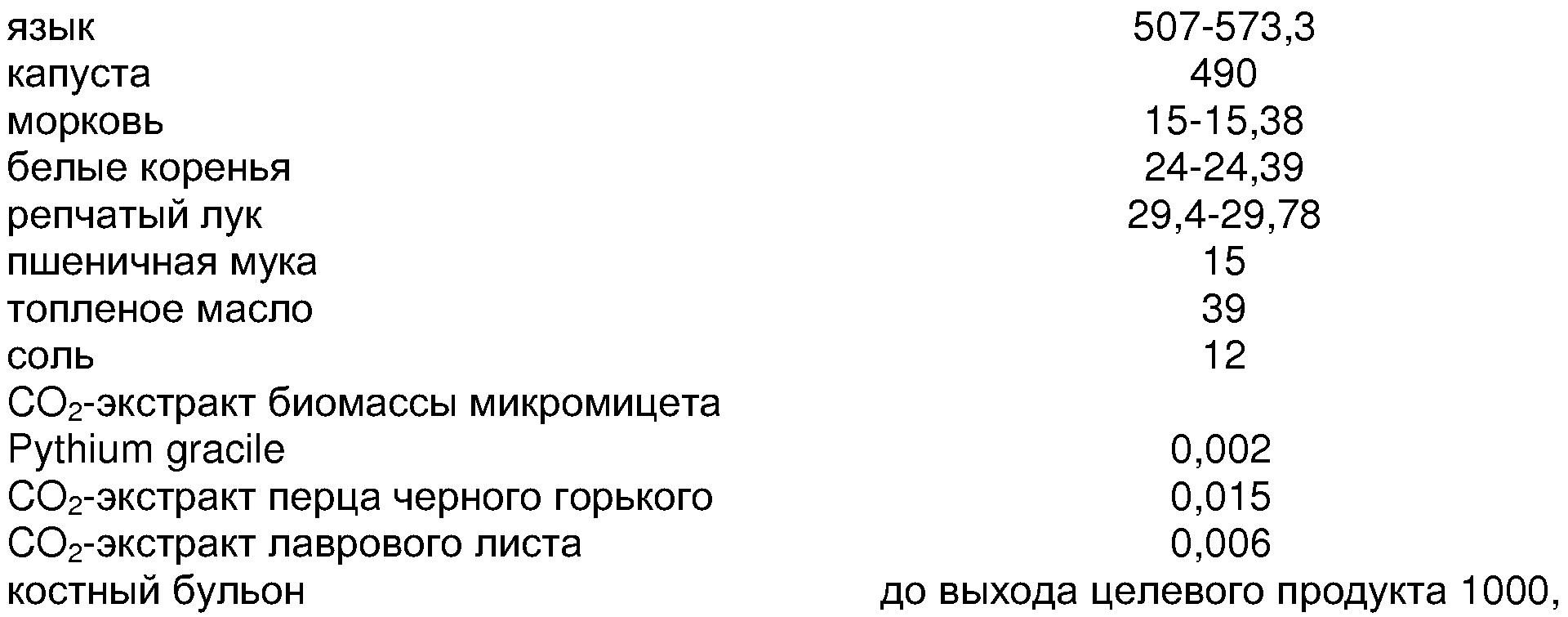 герметизацию и стерилизацию. 3. Способ производства консервов специального назначения, предусматривающий подготовку рецептурных компонентов, шинковку, замораживание и измельчение на волчке свежей белокочанной капусты, резку, бланширование и протирку белых кореньев, бланширование и протирку моркови, протирку репчатого лука, ошпарку, очистку от кожи и измельчение на волчке языка, пассерование в топленом масле пшеничной муки, смешивание перечисленных компонентов с костным бульоном, поваренной солью и СО2-экстрактами биомассы микромицета Pythium gracile, перца черного горького и лаврового листа, фасовку полученной смеси в алюминиевые тубы при следующем расходе компонентов, мас.ч.: