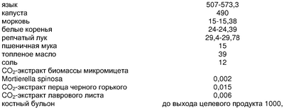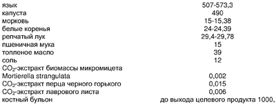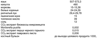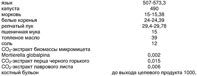 герметизацию и стерилизацию. 18. Способ производства консервов специального назначения, предусматривающий подготовку рецептурных компонентов, шинковку, замораживание и измельчение на волчке свежей белокочанной капусты, резку, бланширование и протирку белых кореньев, бланширование и протирку моркови, протирку репчатого лука, ошпарку, очистку от кожи и измельчение на волчке языка, пассерование в топленом масле пшеничной муки, смешивание перечисленных компонентов с костным бульоном, поваренной солью и СО2-экстрактами биомассы микромицета Mortierella sepedonioides, перца черного горького и лаврового листа, фасовку полученной смеси в алюминиевые тубы при следующем расходе компонентов, мас.ч.: