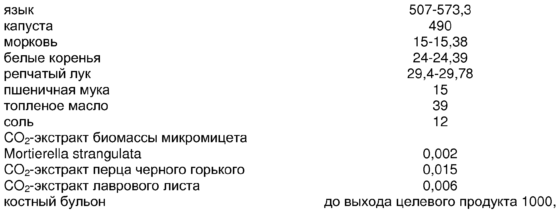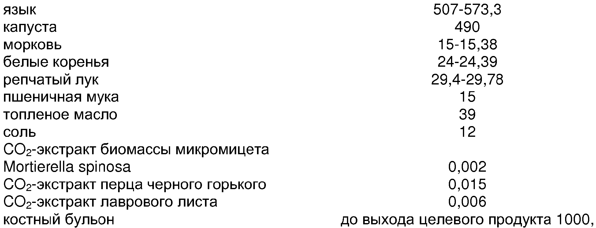герметизацию и стерилизацию. 13. Способ производства консервов специального назначения, предусматривающий подготовку рецептурных компонентов, шинковку, замораживание и измельчение на волчке свежей белокочанной капусты, резку, бланширование и протирку белых кореньев, бланширование и протирку моркови, протирку репчатого лука, ошпарку, очистку от кожи и измельчение на волчке языка, пассерование в топленом масле пшеничной муки, смешивание перечисленных компонентов с костным бульоном, поваренной солью и СО2-экстрактами биомассы микромицета Mortierella verticillata, перца черного горького и лаврового листа, фасовку полученной смеси в алюминиевые тубы при следующем расходе компонентов, мас.ч.: