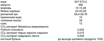 герметизацию и стерилизацию. 5. Способ производства консервов специального назначения, предусматривающий подготовку рецептурных компонентов, шинковку, замораживание и измельчение на волчке свежей белокочанной капусты, резку, бланширование и протирку белых кореньев, бланширование и протирку моркови, протирку репчатого лука, ошпарку, очистку от кожи и измельчение на волчке языка, пассерование в топленом масле пшеничной муки, смешивание перечисленных компонентов с костным бульоном, поваренной солью и СО2-экстрактами биомассы микромицета Pythium ultimum, перца черного горького и лаврового листа, фасовку полученной смеси в алюминиевые тубы при следующем расходе компонентов, мас.ч.: