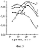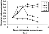 Пример 2. Определение режима физиотерапевтической процедуры, оптимального для конкретного пациента: изменение деформируемости эритроцитов в крови пациентов, подвергаемых внутривенному облучению (фиг.3). Экспериментально-клинические исследования проводились под руководством доктора медицинских наук профессора И.М.Корочкина в отделении терапии больницы №13 УЗ г.Москвы. Пациенты – мужчины в возрасте от 47 до 65 лет с диагнозом “стенокардия напряжения I и II функционального класса”. На всех графиках момент начала внутривенного лазерного облучения соответствует значению t=0. Облучение прерывалось через определенные интервалы времени на 1-2 секунды для отбора нескольких капель крови гепаринизированной микропипеткой с целью последующего анализа. Пробы крови разбавлялись физиологическим раствором в пробирках до 0,3% по объему и затем последовательно вводились в контур рециркуляции. В результате получались временные зависимости, показывающие, как меняется деформируемость эритроцитов у каждого из пациентов во время лазерной процедуры. По ним определялась оптимальная энергетическая доза облучения, рекомендуемая для последующих процедур. У двух пациентов (фиг.3, кривые 1, 2) мощность терапевтического гелий-неонового лазера (633 нм) составляла 1 мВт, у третьего пациента (кривая 3) – 1,5 мВт. Можно видеть, что в последнем случае оптимальная экспозиция в полтора раза короче. Наконец, еще один пациент (кривая 4) получал облучение лазером импульсно-периодического действия (лазер на красителях с накачкой лазером на парах меди) на той же длине 633 нм при средней мощности 1 мВт. Сравнение этой кривой с аналогичными данными для лазера непрерывного действия (кривые 1, 2) показывает, что оптимальная экспозиция в обоих случаях одинакова, т.е., вопреки установившемуся мнению, для лазерной терапии важна не импульсная, а средняя мощность.