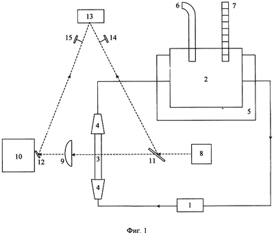 Контур рециркуляции, создаваемой насосом 1, включает в себя приемную камеру 2, плоскопараллельную проточную кювету 3 с переходными патрубками 4 (см. фиг.1). Приемная камера помещена в термостат 5 и дополнительно снабжена световодом 6 и микродозатором 7. Световой пучок от лазерного излучателя 8 пересекает кювету 3 по нормали к ее поверхности и частично рассеивается на эритроцитах пробы. Анализатор рассеянного излучения состоит из объектива 9 и визуализатора 10, установленного в фокальной плоскости объектива. В световом пучке между излучателем и кюветой установлена светоделительная пластина 11, а в зоне каустики объектива перед визуализатором – отражатель 12 прошедшего через кювету и не испытавшего рассеяния излучения. Световые пучки, отводимые светоделительной пластиной и отражателем, сходятся на фотодетекторе 13. Для перекрытия этих пучков используются затворы 14 и 15.