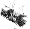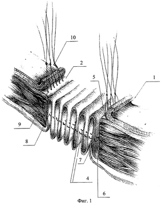 Каждую пару шовных рядов можно выполнять одной нитью, концы каждой нити туго затягивают и завязывают между собой хирургическим узлом с одной стороны грыжевых ворот фиг.2, 5.