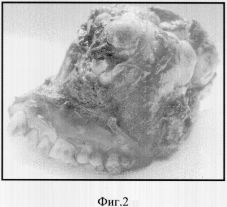 Поддерживающая проволочная сетка 2 подведена под мобилизованный глаз и его вспомогательные органы. Края сетки зафиксированы ущемлением их в маргинальных тканях. Опорный каркас 1 (фиг.1) продвижением в краниальном направлении подведен к комплексу сетка-орган и зафиксирован на краях костного дефекта простым наложением без вспомогательных крепежных средств. Таким образом, пролабированный комплекс сетка-орган оперся на опорный каркас на некоторой площади пятна соприкосновения (фиг.3). Оставшаяся после удаления блока (фиг.2) полость заполнена йодоформным тампоном. Операция завершена установкой защитной пластмассовой пластины, отграничивающей полость рта от послеоперационной полости, и ушиванием раны.