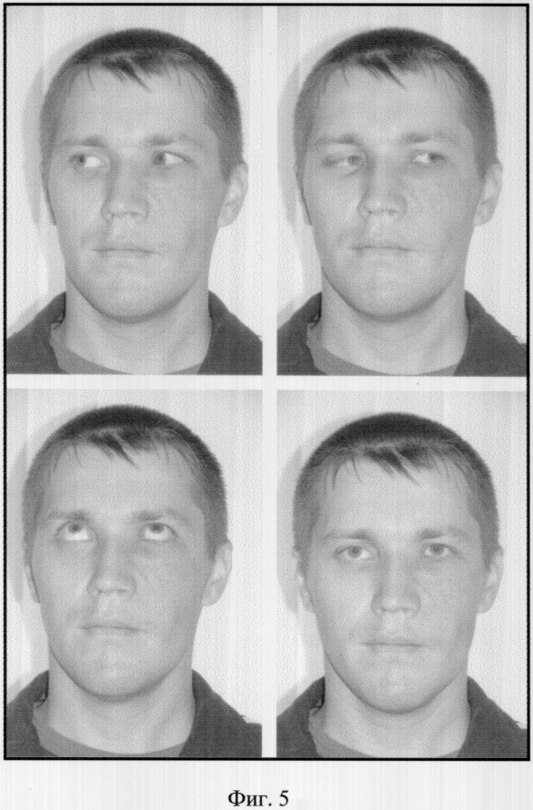 Быстрое (в два раза по сравнению с устоявшимся нормативом) послеоперационное выздоровление больного свидетельствует об успешном вживлении имплантата, а зримые результаты – о функциональном восстановлении. На фиг.5 представлены фотографии анфас больного через 3 недели после операции, которые демонстрируют высокий косметический и функциональный эффект операции, хорошее настроение больного, как признаки успешной медицинской и социальной реабилитации. Сохранены нормальная острота зрения и поля взора, скорректирована дооперационная дистопия левого глаза.