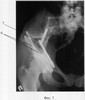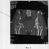 В положении больной на спине осуществлен подвздошный доступ к крылу и телу тазовой кости. Ревизией полости выявлено: тело кости вздуто опухолью бурого цвета. Срочное исследование новообразования и его границ с нормальной костью уточнили картину патологии. Злокачественных клеток не обнаружено. Дистальный участок суставной поверхности вертлужной впадины, примерно площадью 4 см2, отсутствует (5 фиг.6). Зияет головка бедренной кости. Разрушено, на участке, внутреннее кольцо таза; имеется его патологическая подвижность.