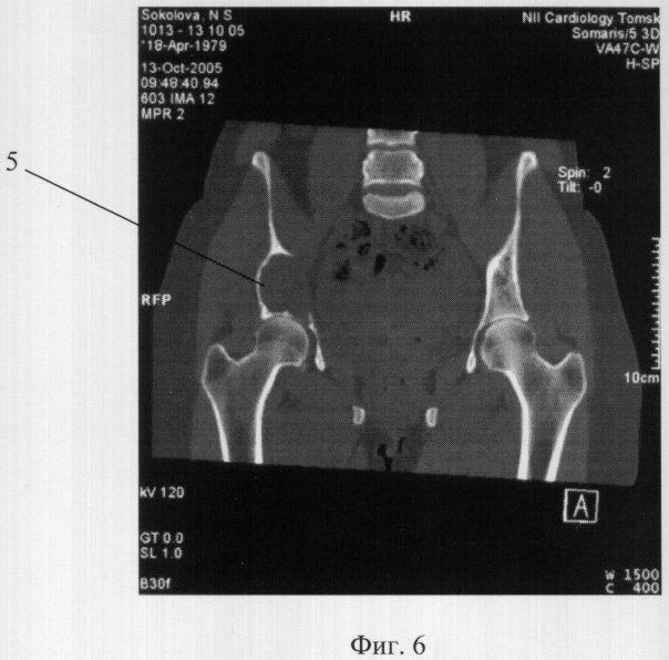 Фиг.6. Рентгенограмма дефекта вертлужной впадины тазобедренного сустава больной. 5 – отсутствующий участок.