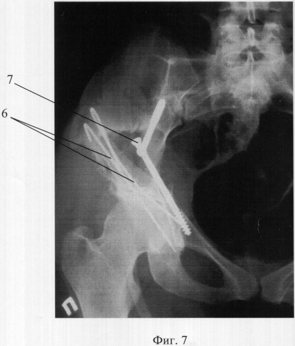 Отсутствующий костный участок сформирован аутокостью из гребня подвздошной кости путем перемещения костного лоскута и плотной укладки на вышеупомянутый имплантат в области его напуска над дефектом. Получившийся слоистый композит фиксирован к тазовой кости спицами 6 (фиг.7). Патологическая подвижность внутреннего тазового кольца блокирована введением спонгиозных шурупов 7 в лонный и подвздошный участки и заполнением дефекта, вкупе с головками шурупов, медицинским цементом. Бедренная кость головкой водворена в восстановленную вертлужную впадину.